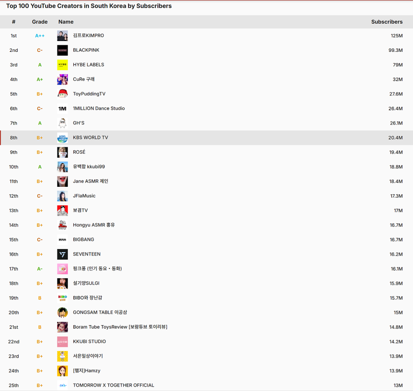 2025년 연말 대한민국 유튜브 구독자 순위