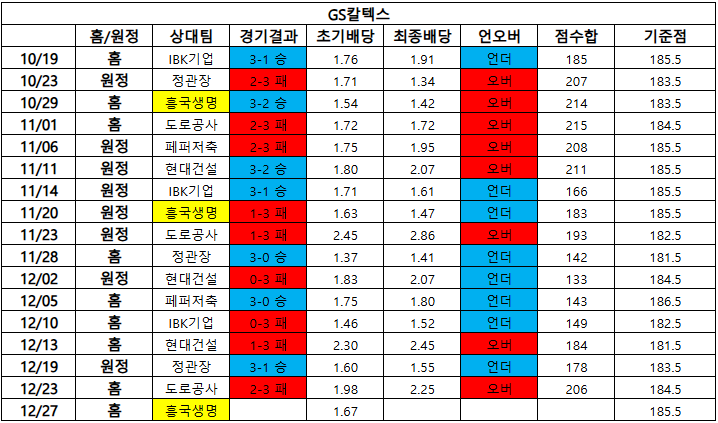 GS칼텍스는 홈 8경기에서 4승4패, 16경기 중 8오버, 8언더