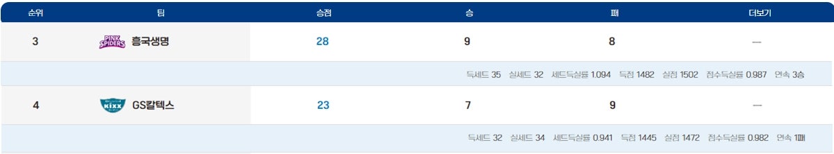 7승9패의 4위 GS칼텍스(홈)와 9승8패의 3위 흥국생명(원정)의 대결